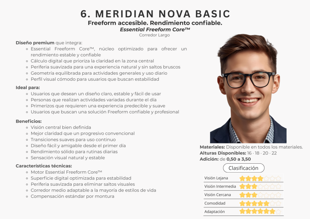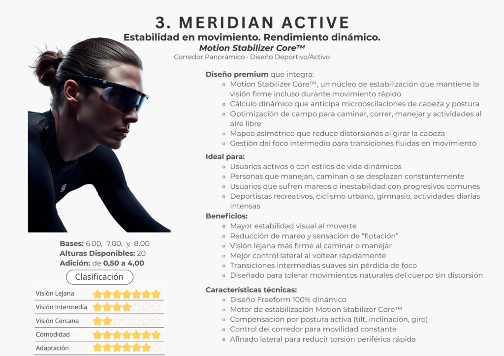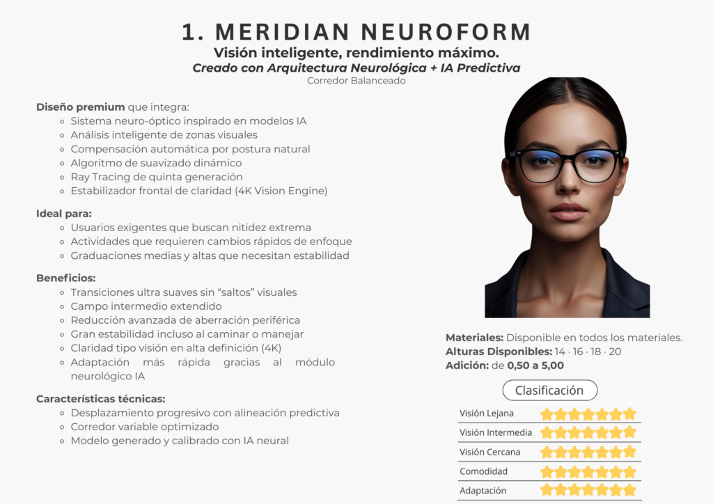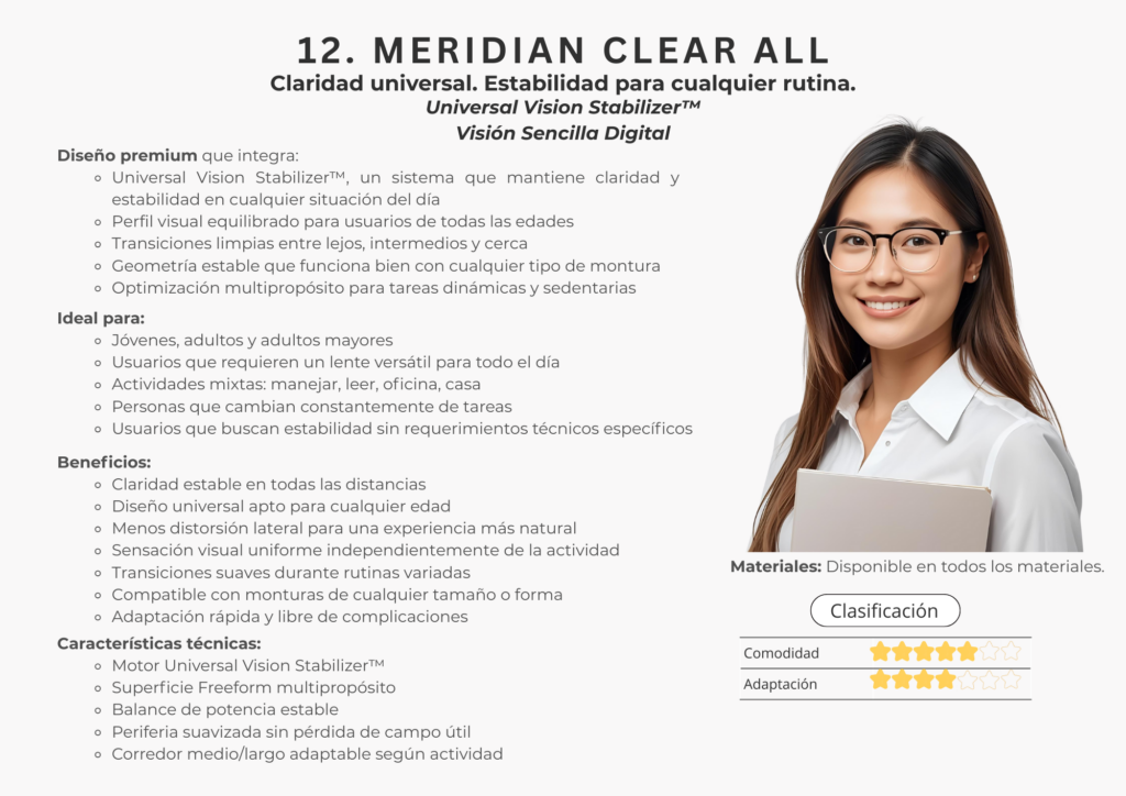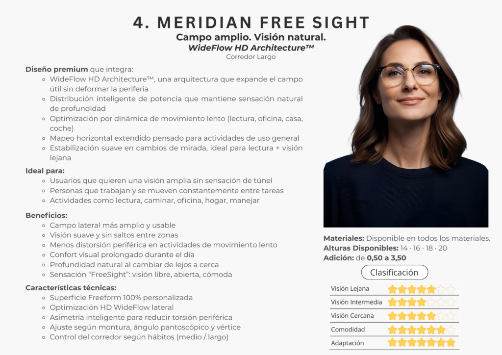 En este catálogo encontrarás la colección completa de lentes Freeform de Meridian Optics, desarrollada bajo estándares internacionales de diseño digital. Cada lente se crea utilizando algoritmos de alta precisión y cálculos individualizados que consideran la montura, la postura visual y las necesidades específicas de cada usuario.