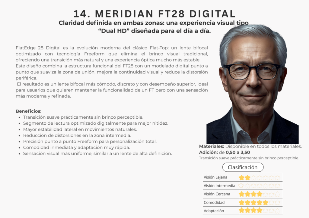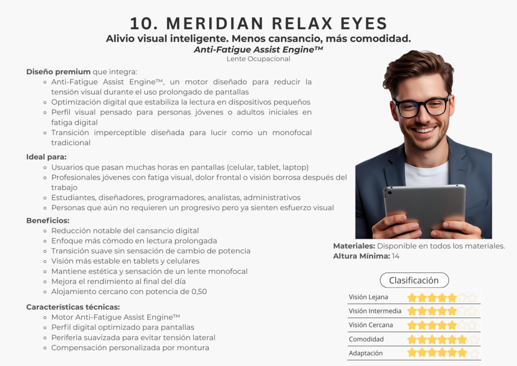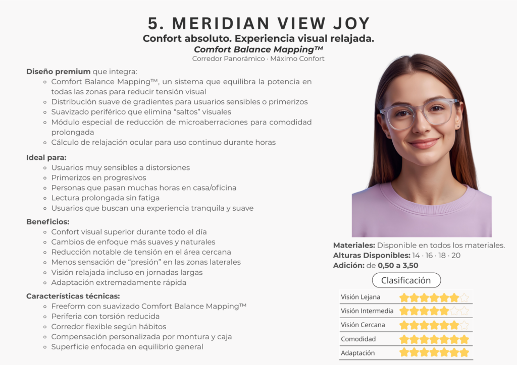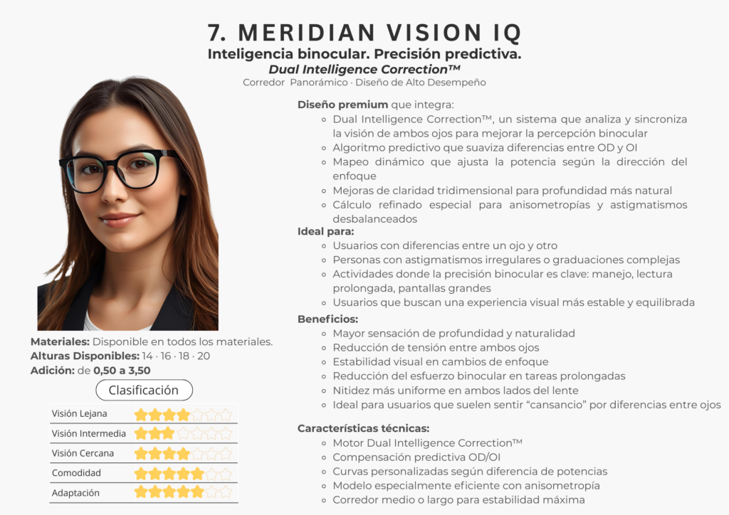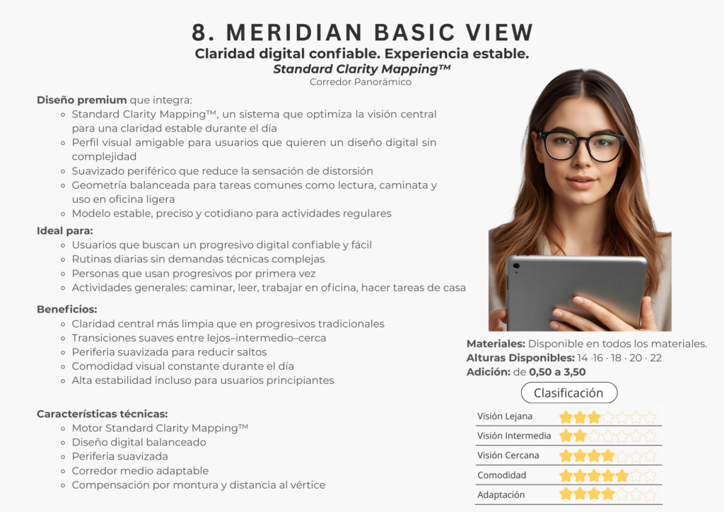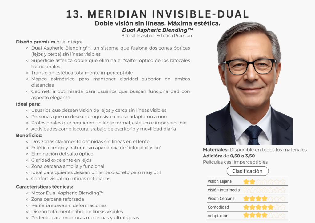 En este catálogo encontrarás la colección completa de lentes Freeform de Meridian Optics, desarrollada bajo estándares internacionales de diseño digital. Cada lente se crea utilizando algoritmos de alta precisión y cálculos individualizados que consideran la montura, la postura visual y las necesidades específicas de cada usuario.
