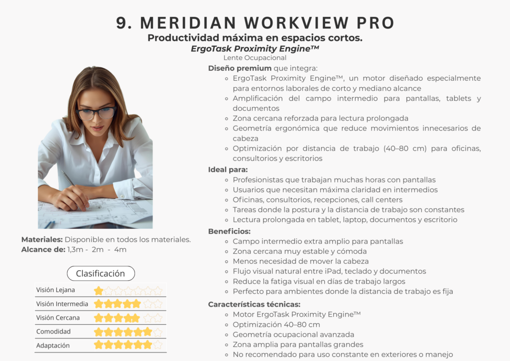 Nuestros diseños han sido pensados para brindar claridad natural, estabilidad visual y una adaptación cómoda, integrando tecnologías de optimización que mejoran el rendimiento en todas las zonas del lente.